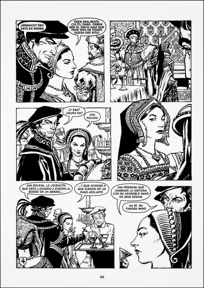 Virtud y vicio de Dago, la noria que no para vuelve a lucir la eficacia de su mecanismo suizo de relojería en las páginas de La cuestión real, tercera aventura (sexto libro) publicada por Comic.ar después del Saqueo de Roma y Lucca , que marcaron el regreso del popular personaje a los kioscos argentinos, tras años de injusta ausencia. En estos doce episodios de doce páginas realizados originalmente para el mercado italiano, las distintas piezas reproducen los mismos pasos que le vimos dar a otros personajes en escenarios similares, con parecidas características traumáticas. Esta vez, el trasfondo político-religioso aparece dominado por el deseo sexual de Enrique VIII hacia Ana Bolena, obsesionado con obtener su divorcio real de Catalina aunque ello implique el divorcio entre la Iglesia de Inglaterra y la Iglesia de Roma.