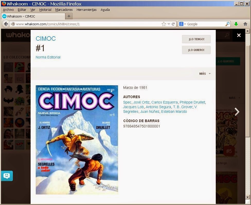Ejemplo de una de las decenas de miles de fichas de Whakoom (arriba) copiadas de Tebeosfera (abajo) en todos sus datos: La imagen, los datos de edición, y loa autores (estos dispuestos en el mismo orden exacto en el que se ofrecen en la ficha de Tebeosfera, que no es alfabético sino por dedicaciones)