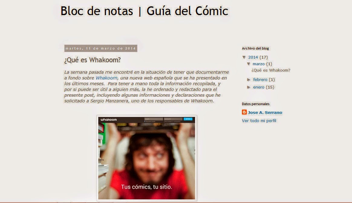 Tuvimos noticia de la existencia de Whakoom en 2013. Se trataba de un proyecto de base de datos de portadas de cómics definido como “red social”, que tenía como atractivo una funcionalidad para agrupar fichas para formar "colecciones virtuales", al uso de como se viene haciendo hace años en bases bien conocidas como The ComicBook DataBase o BDGest’ . En octubre de 2013, Whakoom ya se hallaba en fase de pruebas (como se indicó aquí y aquí) y en noviembre de 2013 se conoció más a fondo la iniciativa a través de entrevistas en varios medios ( Zona Negativa [28/11/13], Nuestros Comics [22/11/13], Manhattan Comics [8/2/14], La casa de El [10/10/13]). Se hablaba entonces de que en su fase “beta” esa base de datos contaba ya con 65.000 fichas de cómics españoles, más 100.000 en curso de incorporación.Es decir, Whakoom había conseguido en pocos meses crear una base de datos sobre tebeos españoles (con sus títulos, fechas de arranque, editores asociados y número de ejemplares por colección) que en Tebeosfera había implicado varios años de investigación, contrastes y mucho trabajo de catalogación, y con múltiples colaboradores implicados. Los responsables de Whakoom declaraban una plantilla de cinco personas, con solamente una dedicada a la catalogación. Tras hacer varias consultas en su base de datos comprobamos que muchas colecciones ofrecían exactamente las mismas imágenes y los mismos datos (fechas de arranque, sellos, autores participantes) que constaban en Tebeosfera.com a fecha de diciembre de 2013 (lo comprobamos y registramos entonces, decenas de miles de fichas). De hecho, varias imágenes usadas en Whakoom conservaban la marca de agua que implementamos en un comienzo en Tebeosfera; muchas otras eran idénticas. La estructura de los datos era la misma también, es decir, si nosotros habíamos indicado como único autor en la colección de La Biblia de Editorial Bruguera a Antonio Bernal, ese era el único autor que constaba en esa publicación en Whakoom. Esta empresa observaba las mismas carencias que nosotros y disponía sus datos en el mismo orden que en Tebeosfera.com, aunque sin expresar el porqué. Los autores de fichas de gran tamaño y complejidad como El Jueves, Joyas Literarias Juveniles, Claro de Luna, Pequeño País, Can Can, El DDT contra las penas… tenían en Whakoom exactamente los mismos contenidos que en Tebeosfera, y eran fichas con imágenes que habían sido localizadas o escaneadas única y exclusivamente para Tebeosfera (en muchos casos no existía otra referencia en toda la red internet para esos contenidos y no se acreditaba la cesión o propiedad de los materiales por ninguna persona física o figurada).