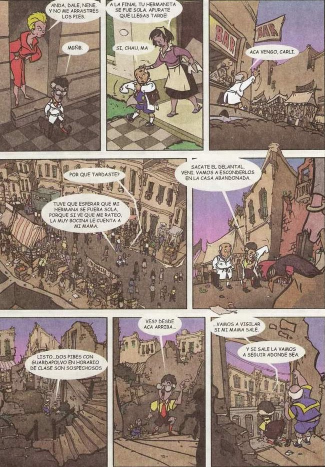 Hace mucho, mucho tiempo que no me divertía así con una historieta. Y cuando digo así, no me estoy refiriendo sólo a la cantidad y la calidad del entretenimiento encontrado, sino al tipo de diversión provista por estas páginas de Quique Alcatena, maestro cerrajero con las llaves para abrir los candados de mi adormilada inocencia infanto-juvenil. Será por el formato apaisado, que me llevó en un viaje temporal sin escalas a mi época de atiborrado lector de patoruzitos, don nicolas, pilusos e hijitus varios, paladines mexicanizados por la Editorial Novaro; y los infaltables libros amarillos de la Colección Robin Hood.