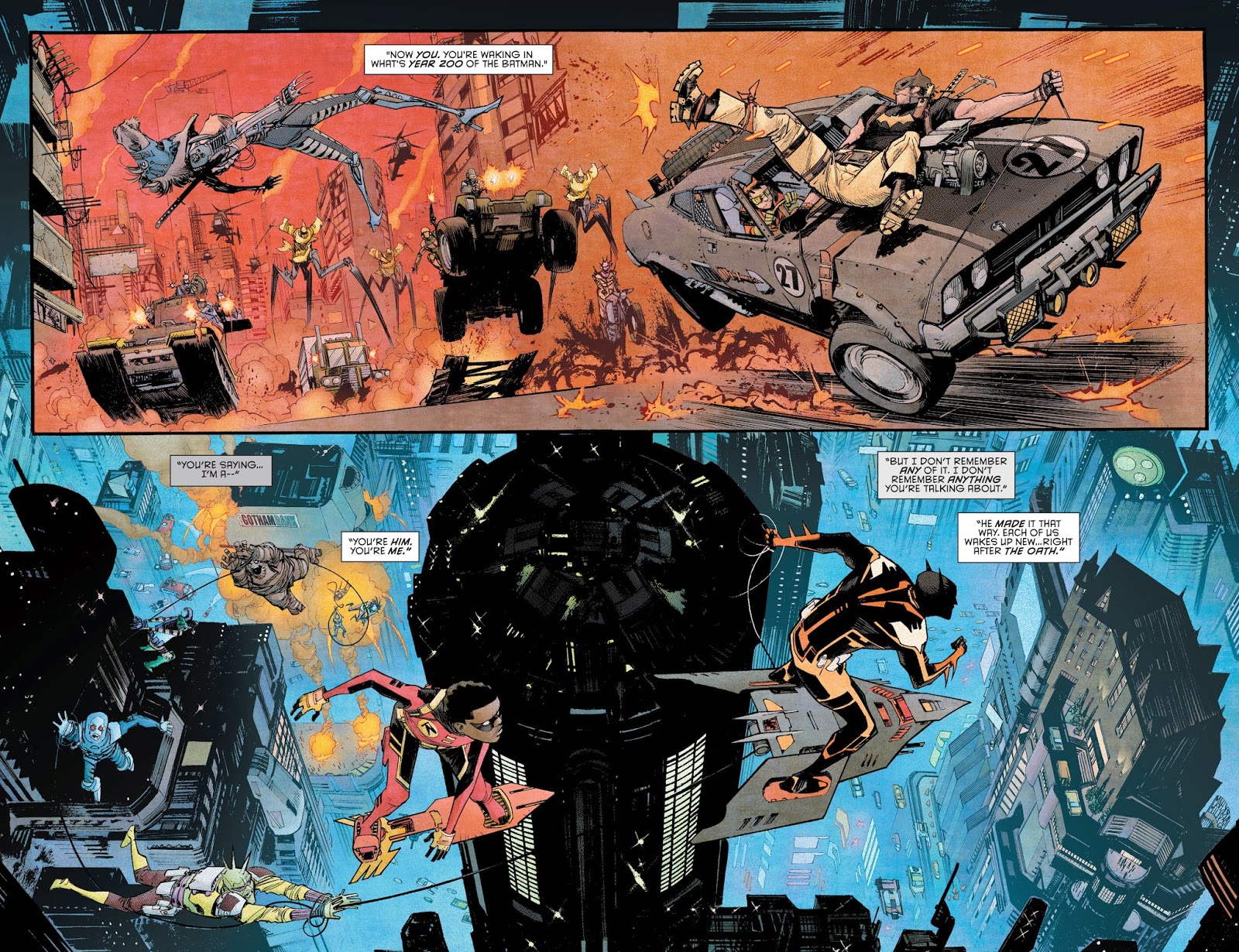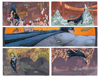 Digamos aquí que las historietas, más allá de su independencia narrativa, se retraolimentan transversalmente en tres instancias básicas. La reconstrucción actualizada de secuencias históricas definitorias, hoy consideradas clásicas (como la primera aventura y el Dark Knight Returns, por nombrar un par); la evolución/involución del Hombre Murciélago, como personaje y como serie, abordada desde distintos niveles de autoconciencia de su naturaleza ficticia; y la comparación contrastada con el próximo gran arco argumental que recorrerá la familia de títulos regulares del superhéroe: Gothopia, un prometedor análisis de un Batman trasplantado a un medioambiente luminoso y abierto, utópico por lo que trae de ¿aparente? felicidad, progreso económico y desarrollo social.
