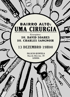 (Información de prensa) El próximo 13 de diciembre, a las 19:00 horas, el Palácio Quintela de Lisboa (Rua do Alecrim, 70), en Portugal, albergará el espectáculo Bairro Alto: Uma Cirurgia, actuación de spoken word, con texto y voz de David Soares; y música de Charles Sangnoir (que también interpretará una canción original, compuesta especialmente para este espectáculo).