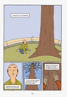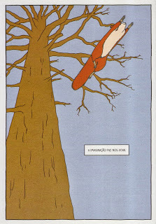 Si Palmas para o esquilo da justo en el blanco es gracias también al trazo minimalista de Pedro Serpa, orgánico contrapunto para esta indagación sobre la naturaleza efímera y frágil de la razón humana. La relación texto-imagen instala la tensión vital entre la densidad de las ideas propuestas y la grácil ligereza de la narración, mide el peso del pasado en nuestro presente proceder; y evalúa nuestra responsabilidad ante ello. De forma deliberada, va saturándonos de información, borrando la frontera entre los hechos y la memoria de los hechos, entre la acción y la reflexión posterior a la acción, entre lo humano y lo animal. Aparentemente lineal y simple, la historieta es en realidad un ensayo profundo y complejo sobre la conformación de un estado de demencia. Un libro difícil de lectura fácil. Exigente, por las puertas que abre y las ligazones personales que nos impone mediante el proceso de lectura. En este camino, encuentra la unidad en la dualidad. Y es mediante esa coexistencia orgánica que logra emocionar interpelando.