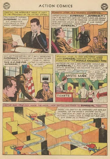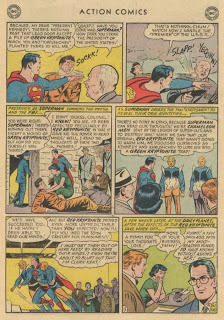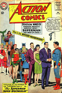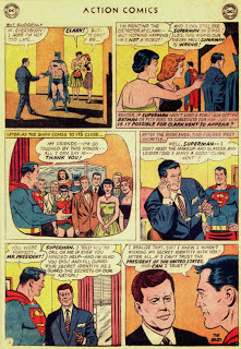 Tomada por sorpresa, DC no pudo evitar la distribución de Action Comics Nº 309, que ganó las calles una semana después del asesinato (1). La historieta The Superman Super-Spectacular, guionada por Edmond Hamilton, dibujada por Curt Swan y entintada por George Klein, giraba alrededor de un homenaje televisivo al Hombre de Acero, en donde todos sus amigos lo honrarían públicamente. Uno de los invitados a estrechar la mano del paladín era, obviamente, el periodista estrella que cubría sus fabulosas hazañas: Clark Kent. Como todo el mundo sabe (fuera de la historieta, al menos), Kent y Superman son la misma persona. ¿Cómo solucionaba el héroe tremendo dilema? Confiándole el secreto de su verdadera identidad a Kennedy; y pidiéndole que se presentara en el set disfrazado de Clark Kent. Después de todo, como le dirá Superman a JFK en el último cuadrito, “si no puedo confiar en el Presidente de los Estados Unidos, ¿en quién puedo confiar?”.