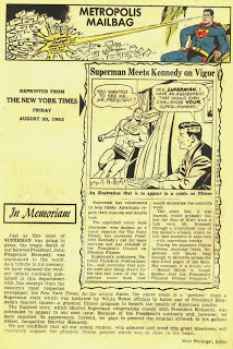 “Esta historia, preparada en íntima colaboración con el desaparecido Presidente Kennedy, había sido pautada para su publicación en Superman Nº 168, cuando la noticia de su trágico asesinato llegó a nosotros. Inmediatamente la levantamos de imprenta y la sustituimos por otro material. Sin embargo, miembros de la Casa Blanca nos han informado que el Presidente (Lyndon) Johnson deseaba verla publicada como tributo a su gran predecesor. Y así dedicamos a la memoria de nuestro desaparecido y amado Presidente, este alegato a su Programa de Salud y Ejercicio Físico, al cual se había dedicado de todo corazón durante su vida…”, explica una larga introducción mientras la fantasmagórica gigantografía de Kennedy recibe el saludo circunspecto de Superman.