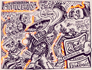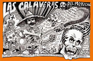 Calaveras del Metiche 201 Ya desde octubre empiezaLa venganza anheladaRuedan títeres sin cabezaLa Muerte hace su entradaEl machete del MeticheEl machete bien filosoDel Metiche justicieroHabrá de mandar al fosoA tanto político con fueroPeña Nieto estira la pataCaerá la calaca copetudade Peña Nieto primerose hará no cabe dudala limpieza del chiqueroEPN descalabra EducaciónPor querer privatizarLa educación a su criterioIrémosle a arrumbarSu trasero al cementerioReformas gandallasCaerá la reforma peñistaIrán a morar al panteónLas mugres leyes fascistasDisfrazadas de evaluaciónMaestros Calacas en lucha¡Viva el generoso mentor!Que defiende con firmezaEl derecho a la educaciónPisoteado con bajezaMaestros y maestrascon su pueblo van unidosno los espantan las bestiasmucho menos sus rugidosGranaderos VS EducadoresLa jauría a que refierousa cascos y macanassiempre agrede fieropor consignas marranasTV podrida vociferaBota pestes e improperiosEsa mugrosa televisiónQuiere echar al cementerioA quien lucha con tesónBoda Televisa Peña NietoEl gobierno condonaMillones a TelevisaSon amantes no es bromaEste dúo de porquerizaProvocadores gatos del gobiernoEnviando a sus infiltradosDesprestigian noble causaLos mandan encapuchados Les caímos en su tranzaHuracanes Manuel e IngridEsos vientos huracanadosAgarraron desprevenidosY dejaron destrozadosA los pueblos más jodidosLaura la desgraciadaY llegó la Laura BozzoPara hacer su faramallaFue la burla en el destrozoIndignante canalladaEn un lodoso alborotoDisfrazada de rescatistaVino a tomarse la fotoPara lucirse como artistaLe cayeron en su chou vilDenunciaron la trastadaEra de Eruviel el MandilY el helicóptero que llevabAristegui periodista dignaA Aristegui con TelebasuraPretenden su voz callarCon una merolica oscuraQue idiotiza por millarLázaro Cárdenas ofendidoLa misma roñosa perradaQue asesinó al gran ZapataQuiere convertir a nadaNuestra herencia del TataPeña Nieto nos la pelasEl petróleo no entregarásTe enciendo cuatro velasPues primero… pifarásCarlos Slim se agusanaMurió el milloneta ojeteAtascado de dineroMurió entre sus billetesEl explotador del mineroLas policías comunitariasEl pueblo ya está en armasContra narcos y soldadosRemojen ya sus barbasAcabarán con los malvadosMasacran a ratones verdesLa selección de TelevisaOfende a México enteroLa Muerte a toda prisaHizo tacos con sus cuerosRock del Angelito al cieloMurió el negrito LaborielDe la onda rocanroleraParó la trompa, aquelPara besar la CalaveraGraco Ramírez AbreuPresumía de socialistaCon dinero capitalistaEste engendro echeverristaEn Morelos se suministraDesgobierna este pingoY se tapa las orejas Para no oír las quejasCon el Placido DomingoTermoeléctrica MacabraHuexca y la calaca eclécticaTendrán su silla de verdadSerá muy TermoeléctricaPara matar su vecindadMineras AsesinasEl diablo quiere el oroDe Morelos en gran tajadaEl pueblo grita a coroQue se vayan a la chingadaParquímetros Nego(su)cioEn parquímetros lo mismoMejor negocien a su madreY no a los espacios públicosQue Cuautla está que ardeDespedida MetichonaCuando muera dejar quieroEn Axochiapan mi morral,En Anenecuilco mi sombrero,Y en Cuautla mi costalAdiós buenos amigosY a los que les caigo malMe muero sin quejidosLos dejo descansarQue La Calavera JusticieraDe lacras los va a limpiarQuiera que no se quieraAcabará con tu penar.