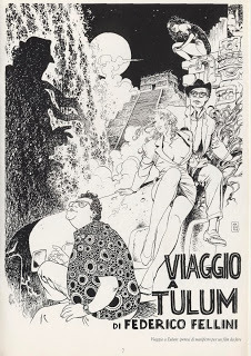 El momento del cambio en Viaggio a Tulum Al principio de Viaggio a Tulum, una hermosa metáfora corporizó las películas nunca realizadas por Fellini en un cementerio submarino de aviones, hundidos en el fondo del estanque de Cinecittà. Uno de ellos llevaba grabado en el fuselaje la palabra “Mastorna”. El viaje de G. Mastorna era el título del filme que Fellini iba a realizar en 1965, bajo producción de Dino de Laurentiis. Y aunque se habían comenzado a construir monumentales decorados, la filmación nunca llegó a concretarse, la relación entre director y productor se rompió y un terrible embargo cayó sobre los bienes de Fellini. Por esta razón, durante la puja legal Fellini colaboró con el dibujante Dino Buzzati en la historieta/encuesta In cerca dell’Italia misteriosa, para el Corriere della Sera.