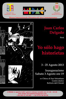 (Información de prensa) La temporada artística 2013 del Museo Internacional Dinámico de Arte Contemporáneo - MIDAC (Italia), continúa con la exposición individual Yo sólo hago historietas de Juan Carlos Delgado (Perú). La exposición, curada por la asociación cultural Terra dell’Arte y con el patrocinio de la Municipalidad de Belforte del Chienti, será visible en la antigua iglesia de San Sebastián, sede del MIDAC en Belforte del Chienti, del 3 al 25 de Agosto 2013.