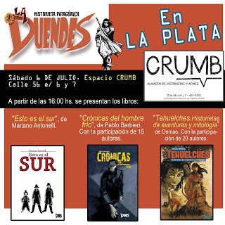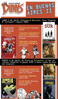 Cronograma:Lunes 1º de julio, en la Biblioteca Nacional, Agüero 2502, a partir de las 18:00 horas:Presentación de los libros Esto es el sur, de Mariano Antonelli; Tehuelches. Historietas de aventuras y mitología, de Oenlao y con la participación de 20 autores; y ¡Bairoletto!, el bandido rural y otras historias (ver http://labitacorademaneco.blogspot.com.ar/2013/03/lugar-comun-la-muerte.html), de Juan Dalfiume.Martes 2 de julio, en Mu Punto de encuentro. El bar de lavaca, Hipólito Yrigoyen 1440 (a media cuadra de la Plaza del Congreso), a partir de las 18:30 horas:Presentación de los libros Crónicas del Hombre Frío, de Pablo Barbieri y con la participación de 15 autores; Homenaje a Malvinas (ver http://labitacorademaneco.blogspot.com.ar/2013/05/la-perdida-perla-austral.html); y Sol de Noche (ver http://labitacorademaneco.blogspot.com.ar/2013/01/para-la-libertad.html), de Guillermo Saccomanno y Patricia Breccia.