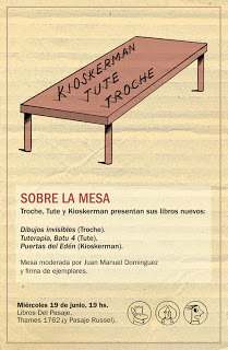 (Información de prensa) Están todos invitados a Sobre la mesa, presentación colectiva de los nuevos libros de Troche (Dibujos invisibles), Tute (Tuterapia, Batu 4) y Kioskerman (Puertas del Edén), el miércoles 19 de junio, a las 19:00 horas, en Libros del Pasaje (Thames 1762, Ciudad Autónoma de Buenos Aires).