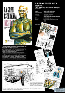 Ediciones Vitruvio arranca su colección Novela Graficcon una historia singular, provocadora, rápida y salvaje: La historia del primer campeón del mundo de los Pesos Pesados de raza negra en los Estados Unidos en 1910. El relato comienza con el último día en la vida de Jack Johnson, “el gigante de Galveston”, el mejor boxeador y el afroamericano más popular en los primeros decenios del siglo XX. Aquel día, después de un incidente en un café a causa de su raza, se estrelló con su veloz coche y encontró la muerte.A partir de aquí, arranca el relato de la ascensión de Jack hasta el olimpo de los dioses, desde su dura infancia en Galveston, hasta sus vagabundeos a lo largo y ancho del país, en pos de una vida mejor y un futuro como boxeador. Asistimos a su ascenso en el escalafón, a sus amoríos, a sus problemas con la justicia, a la subversión del orden establecido, a su determinación para rebelarse contra lo que consideraba injusto. A su enfrentamiento con las normas sociales. A conseguir ser campeón del mundo de los pesos pesadosTodo ello narrado con absoluta fidelidad a la historia, aderezado con humor, desenfado y sin obviar los aspectos más polémicos de la apasionante biografía del boxeador. Escrito en orden cronológico, el libro es una carrera hasta el momento culmen de su vida. Su enfrentamiento con Jim Jeffries en el llamado “combate del siglo”, en Reno, Nevada, en Julio de 1910. Antes de ese combate, el escritor Jack London había clamado para hallar a “la gran esperanza blanca”, que despoyese del título mundial a un hombre de raza negra como Johnson. El título hace referencia irónica al fallido requerimiento del escritor.El libro es un compendio de la dura vida, anécdotas hilarantes, retrato de los bajos fondos, apostadores, amantes, viajes, sangrientos combates, determinación, rebeldía y final feliz para nuestro héroe. En una de las épocas más convulsas de la historia de los Estados Unidos. Una relato épico en 72 páginas ilustrado por José Parra-Moreno y escrito por José María Mijangos Más información: www.realblackhope.wordpress.com