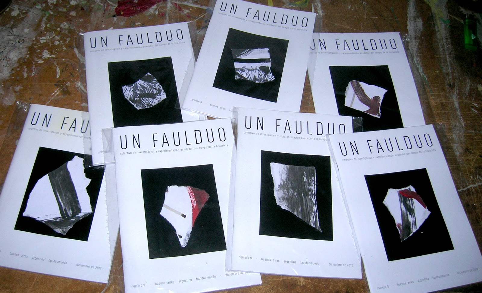 Cada tapa de los 500 ejemplares de Un FaulduoNº 9 está intervenida con un fragmento del Mural Exponencial realizado durante la presentación de las Adaptaciones Académicas II en el Segundo Congreso de Historietas Viñetas Serias en la Biblioteca Nacional.