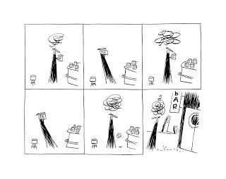 Saquemos a los habitantes del cuadro y pongamos en su lugar a los personajes clásicos del cine de terror y aventuras (el cazavampiros Van Helsing, la Momia, el Vampiro, el Hombre Lobo, el Hombre Invisible, Frankenstein, el superheroico Masked Avenger, algún mago con poca cordura y un hombre con dos cabezas), pero fijémoslos en la retina y el corazón con los rostros, mañas y actitudes de los actores que los encarnaron (dentro y, algunos, fuera de la pantalla) en un cine barato y rápido, filmado en blanco y negro, con más talento que recursos, con más personalidad que guión. Hagamos de cuenta que los parroquianos acodados en la barra son el fruto del cruce cruel, tan despiadado como cariñoso, que la industria hollywoodense hizo de Bela Lugosi con Drácula, de Johnny Weissmuller con Tarzán, borrándoles el límite entre la fantasía y la realidad antes de tirarlos al tacho de basura. Y, por último, reemplacemos el registro dramático de Hopper por uno cómico, cercano al slapstick, ese humor físico de situaciones forzadas hasta el límite de lo absurdo, lo bizarro y lo ridículo. El resultado, se me antoja, será algo muy parecido a lo que Nicolas Mahler alcanza en esta preciosa joya intimista que se llama Van Helsing’s Night Off.