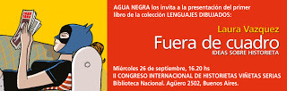 La presentación oficial de Fuera de cuadro y de la colección Lenguajes dibujados se realizará mañana, miércoles 26 de septiembre, a las 16:20 horas en la Biblioteca Nacional (Agüero 2502, Ciudad Autónoma de Buenos Aires), dentro del marco del II Congreso Internacional de Historietas Viñetas Serias.Laura Vazquez es Doctora en Ciencias Sociales por la Universidad de Buenos Aires, investigadora del CONICET y docente en la UBA. Ha sido invitada como expositora en congresos nacionales e internacionales; organizó jornadas sobre historieta y humor gráfico y es autora de numerosos artículos vinculados al tema. Su libro El oficio de las viñetas. La industria de la historieta argentina (Paidós, 2010) es resultado de su tesis doctoral. Vazquez dirige el Congreso Internacional de la Historieta y el Humor Gráfico Viñetas Serias (Biblioteca Nacional, 2010; 2012). Paralelamente a su actividad crítica, ha publicado novelas gráficas como guionista en la Argentina y en España: Entreactos (Astiberri) e Historias Corrientes (Ediciones De Ponent). Realiza junto a Dante Ginevra la tira 70 metros para Telam, escribe un libro sobre Copi y la sección mensual Ojo al Cuadrito en la revista Fierro. Obtuvo una beca del Fondo Nacional de las Artes (2012). Periódicamente escribe su folletín Suave Canesú (http://suavecanesu.blogspot.com.ar/).Lenguajes dibujados es un nuevo proyecto de Agua Negra para la construcción de una biblioteca de libros sobre historietas: Textos teóricos, de crítica y de ensayo, con aire nuevo, rigor intelectual sin imposturas y enfoques multidisciplinarios. La colección no buscará delimitar a la historieta como objeto de estudio uniforme, sino potenciar su hibridez y heterogeneidad como lenguaje, arte y medio de comunicación. En esa dirección, Fuera de cuadro propone algunas bases para los futuros títulos de la serie: Abordajes novedosos sobre cuestiones de lenguaje, del estado del campo o relativas intrínsecamente a la técnica y el oficio.[image error]