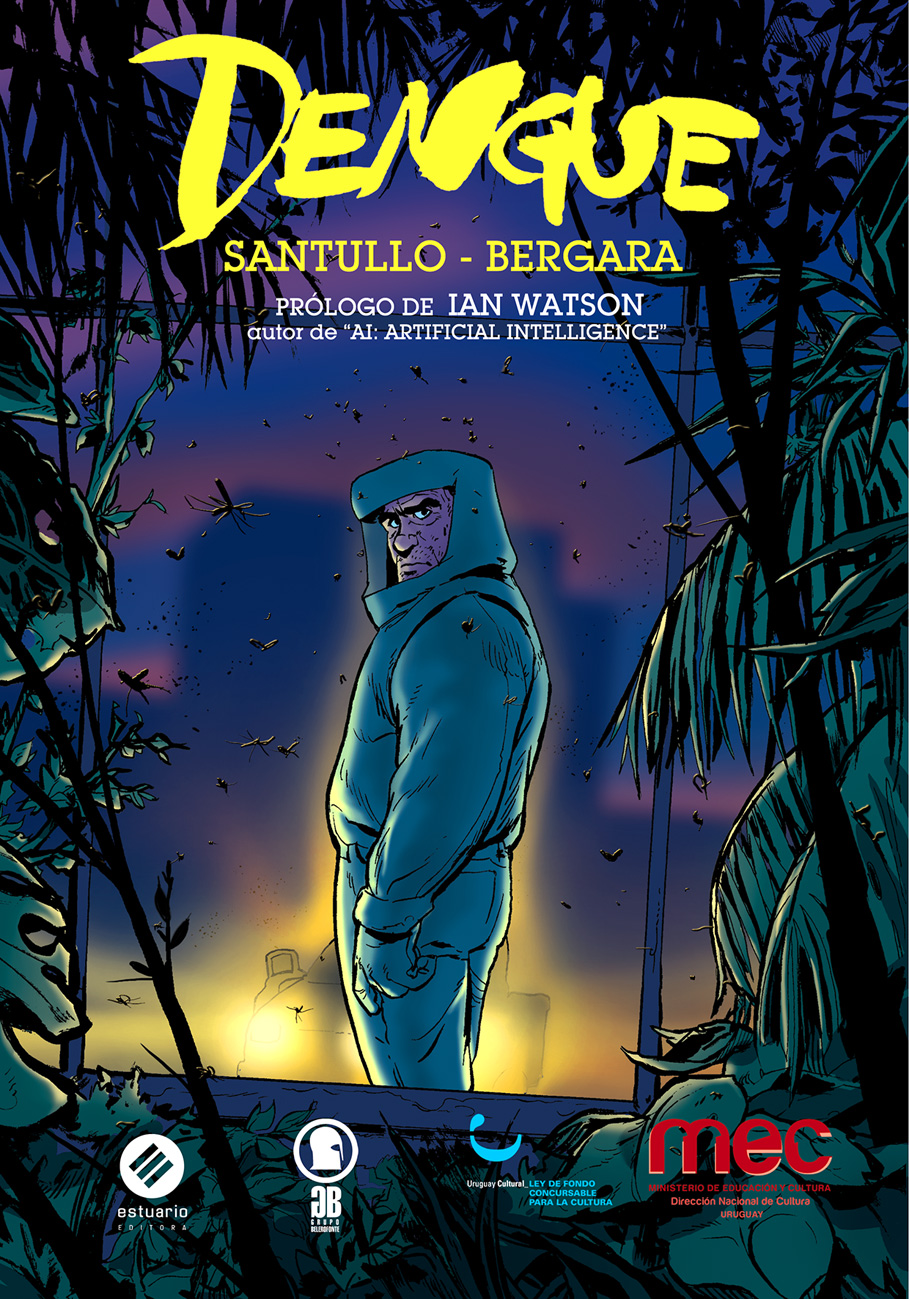 Dengue. Guión:Rodolfo Santullo. Dibujos: Matías Bergara. Color: Matías Bergara. Portada:Matías Bergara. 96 páginas a todo color. Editorial Estuario / Editorial Belerofonte. ISBN: 978-9974-98-635-0. Uruguay, mayo de 2012.[image error]