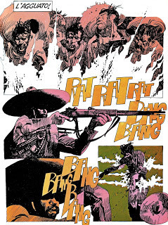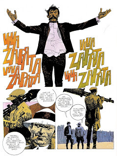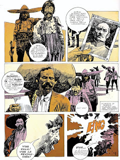 Esto hacía de Toppi el artista idóneo para encarar la historia de ¡Viva México!, que no era otra que la historia de la revolución mexicana, apretada en un par de páginas simbólicas que intentaban transmitir la idea de la lucha política por el poder para cambiar el correlato de fuerzas y devolverle la dignidad (y la posesión de las tierras, que no es un dato menor) a los pisoteados de siempre, los campesinos a los que se les estaba robando la vida. Hay una prejuiciosa mirada sobre lo mexicano, es cierto, pero el cómic se esfuerza por mostrar la coexistencia entre la civilización y la barbarie en ambos bandos, en un momento en que el final histórico todavía no había sido escrito. Con la intervención norteamericana como sombrío telón de fondo, la escala humana de la Revolución queda resuelta en el cruce de cuatro personajes, dos mexicanos (Pancho Villa y Emiliano Zapata) y dos norteamericanos (un cineasta y un agente secreto), ejemplos yuxtapuestos de lo que debería ser la moral revolucionaria.
