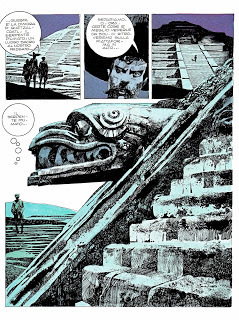 Con el tiempo, mi percepción de Toppi fue variando. No me gustaron sus trabajos más industriales, dedicados a vidas de santos, papas y figuras históricas varias. Me parecieron (me siguen pareciendo) distorsiones innecesarias (o necesarias para pagar las cuentas, que para eso también se trabaja, no?) que quitaron a Toppi el tiempo para hacer otras obras maestras como Il Collezionista o Sharaz’de, por nombrar las más conocidas entre sus vastas colaboraciones para las revistas Alter Alter, Linus, Comic Art y L’Eternauta. Con el tiempo, distintos libros de Toppi han pasado por mis manos pero, por una u otra razón, nunca terminaron definitivamente en mi biblioteca. ¡Viva México!, en cambio, me ha venido acompañando desde aquellos lejanos ’80, un par de mudanzas incluidas. El martes pasado, 21 de agosto, mientras recorría una vieja librería de Avenida de Mayo, me encontré con un ejemplar de L’Uomo di Messico, edición italiana original del ¡Viva México! del que venimos hablando. Estaba a un precio irrisorio de saldo y la compré, a pesar de que (o tal vez porque) tenía las tapas descajetadas, le faltaba un pedazo del lomo y algunas hojas estaban sueltas. Se notaba que era un ejemplar que había sido leído y releído, muchas veces. Al llegar a mi casa me enteré de la muerte de Toppi. Y ahí tuve la verdadera revelación.