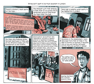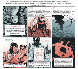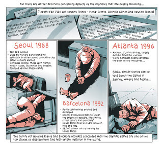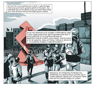 Una cosa son los Juegos Olímpicos y otra (muy distinta) los deportes y los deportistas, obvio. El primero es una estructura comercial de poder, que explota el capital simbólico de los segundos y su amplia penetración en el mundo de los aficionados a las prácticas deportivas. Una máscara que vampiriza el concepto originario de los Juegos Olímpicos, generando una serie de daños que no gozan de la difusión mediática que obtienen los beneficios, si es que realmente se obtiene algún beneficio. En el sitio web Cartoon Movement (http://www.cartoonmovement.com/), la plataforma editorial virtual más importante de la historieta periodística inglesa, el británico Tom Humberstone, historietista e ilustrador, editor de la tan pequeña como imprescindible Solipsistic Pop (http://solipsisticpop.com/), colgó para quien quiera verla The London Olympics, diez páginas de demoledora contundencia y seria mirada crítica sobre un fenómeno complejo e interesante, echando luz sobre la parte oculta del iceberg que reaparece cada cuatro años, con precisión matemática.