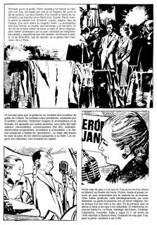La verdad sea dicha. A diferencia de Che, esta Evita es una historieta bastante fallida. La ausencia gráfica de Enrique Breccia se nota, y mucho. Como en el trabajo de Guevara, los dibujos de Alberto Breccia apuntalan el carácter periodístico-documental del cómic. Son fotos dibujadas que reproducen la cáscara de los acontecimientos, copian rostros, vestuarios y escenarios. El guión de HGO (¿primerizo borrador a la espera de futuras correcciones?) es moroso en las descripciones, renuncia a los diálogos, se queda con el peso sentencioso de las palabras. Las viñetas exponen los logros, los cambios radicales que Evita fraguó en la sociedad argentina: El voto femenino, la restitución de derechos en vivienda, salud, empleo y promoción de la mujer, la obra pública que rediseñó el paisaje externo e interno de la Nación; pero no profundizan el intercambio entre el personaje real, su impronta mítica y el tiempo histórico que se transita.
