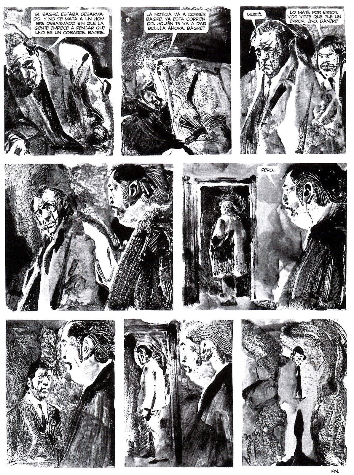 No es para menos. La historieta se gestó entre 1974 y 1977. Años de plomo; de la Triple A como premonición de lo peor del Proceso; de la juventud maravillosa devenida un imberbe, estúpido e infiltrado Gregorio Samsa; del volver a luchar después del “luche y vuelve”. En este punto, la historieta participa del ensayo y la ficción se muestra como un retrato que confluye con la Argentina de esos años. Metáfora de un exterior gris que se ennegrece irremediablemente. Hablando de Un tal Daneri, el Larousse define la palabra sinestesia: “Tipo especial de sensación que se percibe en más de una localización, siendo el estímulo único”. Inteligente. Imaginativo. Rigurosamente angustiante.