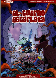 El Cuerno Escarlata, primera colaboración creativa entre Carlos Trillo (guión) y Lucas Varela (dibujos), logra un hecho impensado. Apoyándose en el transitado escenario de las tierras mágicas donde los hombres y los animales antropomórficos conviven sin ningún tipo de problemas, los autores resignifican el género de la Fantasía Heroica, tan asociado a la cultura angloparlante; y lo transcriben en parámetros rioplatenses. Guarda ciertas similitudes con el ciclo de La Mazmorra de Joann Sfar y Lewis Trondheim, es cierto; y hasta con el Groo de Sergio Aragonés y Mark Evanier, pero los parecidos se agotan en la satirización de un modelo, en la deconstrucción de las estructuras conocidas para así construir, con los mismos elementos pero distinta mirada, otro tipo de relato. Un relato entramado por los imaginarios locales sobre la vida, el poder, el amor, la amistad.