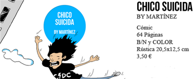 Chico suicida es el cómic de By Martínez (Miguel Martínez, Barcelona, 1981. http://bymartinez.tumblr.com/) que para la ocasión crea nuevas historias. Además incluye viñeta invitada realizada por Juarma (http://juarma-lopez.com/). Es una viñeta donde el protagonista encuentra ese tiempo que a menudo las personas no tenemos en nuestro día a día para poder reflexionar. A modo de pequeñas lecciones de vida, con una buena dosis de humor. Todo ello mientras cae desde un rascacielos y se dirige a su fatal destino "Espachurrarse contra el frío y duro asfalto". Chico suicida tiene respuesta para todo, o para casi todo. El cómic ya está disponible a la venta desde la web de la editorial o en algunas tiendas (ver listado en www.underbrain.com/books).