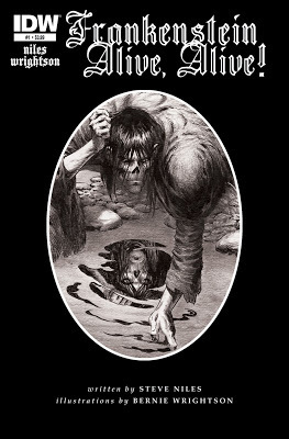 Frankenstein Alive, Alive! Nº 1. "Pocos trabajos han alcanzado el reconocimiento universal y reverencial obtenido la versión ilustrada del Frankenstein de Mary Wollstonecraft Shelley a cargo de Bernie Wrightson, publicada por vez primera en 1983. Después de casi 30 años, Wrightson regresa a su pasional proyecto con una historieta que comienza tras el final de la clásica novela, aclamada como una de las más grandes historias de horror de todos los tiempos. Steve Niles, frecuente colaborador de Wrightson, es el encargado de guionar esta épica esperada por décadas. En aparente blanco y negro, cada una de estas páginas ha sido escaneada en color para replicar, de la manera más fidedigna posible, la experiencia de mirar el arte de las páginas originales, exhibiendo los exquisitos detalles del trazo con pincel de uno de los más grandes artistas vivos de la industria actual del cómic. Cada número también incluye materiales suplementarios, como entrevistas, ensayos y la serialización de una prosa original de Shelley".