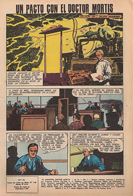 Debo reconocer que abrí estas páginas con bastante temor. Suena obvio, ya que estamos hablando del Dr. Mortis, pero lo que me asustaba no era la capacidad absoluta para el mal de su personaje protagónico, sino la posibilidad de desencantarme con ese material que recordaba con tanto cariño. A fuerza de ser sincero, el paso del tiempo no ha sido lo suficientemente benévolo con estas historietas. O mi mirada ya no es la misma, curtida ahora por lustros de efectos especiales, vivencias personales y otro tipo de lecturas. Ante los ojos modernos, los guiones y los dibujos, aún manteniendo su efectividad, se perciben como algo tosco, bastante previsible. Es que el terror de Mortis es un terror anclado fuertemente en los arquetipos de los '50, pendulando entre la repulsión física y el asco hacia las manifestaciones físicas del horror; y una impronta psicológica nacida de uno de los grandes miedos alimentados por la Guerra Fría: El peligro inmanente a toda tecnología de avanzada, los riesgos de la ciencia desbocada, carente de ética. Hay algo de denuncia social, metaforizada como corrupción moral. Cierta asimilación entre lo extranjero y lo extraño, facilitado por las ambientaciones europeas relativamente contemporáneas (Baviera y Nápoles, en este tomo). Y una sensibilidad pulp fuertemente influida por la literatura del género, en este caso en particular Frankenstein, Fausto y Lovecraft.