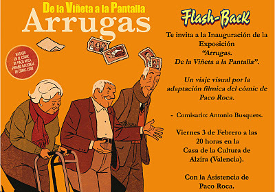 Flash-Back Producciones presenta la exposición oficial del filme Arrugas, basado en la célebre y galardonada obra del versátil historietista valenciano Paco Roca, Premio Nacional de Cómic 2008. Una amplia muestra comisariada por Antonio Busquets que recorre todo el proceso creativo del filme, nominado a los Premios Goya en las categorías de Mejor Película de Animación y Mejor Guión Adaptado. Un amplio recorrido audiovisual desde su afortunada génesis como álbum de cómic premiado internacionalmente, hasta el aplaudido estreno de su adaptación fílmica en las pantallas cinematográficas.