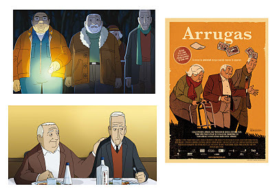 Arrugas es un largometraje de animación 2D para un público adulto basado en el aclamado cómic del mismo título de Paco Roca (Premio Nacional de Cómic 2008). Arrugas (ver http://labitacorademaneco.blogspot.com/2011/02/el-miedo-la-hoja-en-blanco.html) narra la amistad entre Emilio y Miguel, dos ancianos recluidos en un geriátrico. Emilio, que acaba de llegar a la residencia en un estado inicial de Alzheimer será ayudado por Miguel y otros compañeros para no acabar en la planta superior de la residencia, el temido piso de los asistidos que es como llaman allí a los desahuciados. Su alocado plan tiñe de comedia y ternura el tedioso día a día de la residencia porque aunque para muchos sus vidas habían acabado, ellos acababan de empezar una nueva. Nominado a los Premios Goya de la Academia de las Artes y las Ciencias Cinematográficas de España en las categorías de Mejor Película de Animación y Mejor Guión Adaptado. Nominado en la categoría de Mejor Película de Animación en los Premios Gaudí de la Academia del Cine Catalán. Nominado en la categoría Mejor Película en los Premios Annie que entrega la International Animated Film Association, Asifa - Hollywood en Los Ángeles. El filme Arrugas se estrena en las salas cinematográficas españolas el 27 de Enero de 2012. Dirigido por Ignacio Ferreras, Arrugas es una producción de Manuel Cristobal para Perro Verde Films, Cromosoma, TVG.