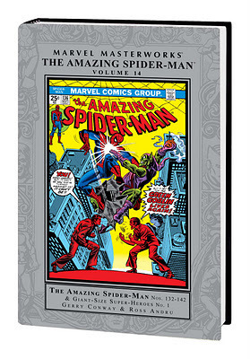 Marvel Masterworks: The Amazing Spider-Man Vol. 14. "Peter Parker nunca tuvo una vida fácil. Cuando está empezando a pilotearla, se le aparecen el Hombre Fundido, Morbius y el Hombre Lobo y, ya lo sabes, te encuentras en medio de las grandes aventuras del Hombre-Araña. Parado al borde de la locura desde la muerte de su padre (alias el Duende Verde), Harry Osborn da el paso que falta para caer en el precipicio y tomar el manto del archienemigo de Arañita. Con su mejor amigo decidido a matarlo, el encuentro no apto para cardíacos terminará por redefinir el mundo del trepamuros durante las próximas décadas. Además: Debuta Tarántula, regresa Punisher y hacen cola el Gusano Mental, el Oso, Mysterio y el Chacal. Lo que se dice una dosis colmada de Masterworks arácnidos. Compilando The Amazing Spider-Man Nº 132 a 142, Giant-Size Super-Heroes Nº 1 y Marvel Treasury Edition Nº 1". Por Gerry Conway (guiones), Ross Andru, Gil Kane y John Romita (dibujos). Portada de John Romita.