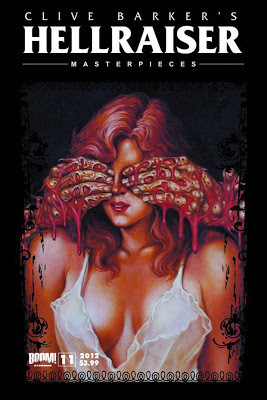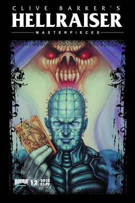 Hellraiser Masterpieces Nº 12. "La vision de Clive Barker sobre las más viles criaturas del infierno cobran vida en los episodios 13 y 14 de The Devil's Brigade. Ron Wolfe (guión) y Kieron Dwyer (dibujos) firman Breakdown in Red; y Nicholas Vince (guión) y Andrew Paquette (dibujos) se unen para Echoes, Dreams ans Revelations. Ningún hombre sobre la tierra está fuera del alcance de los cenobitas". Portada de James Sherman.