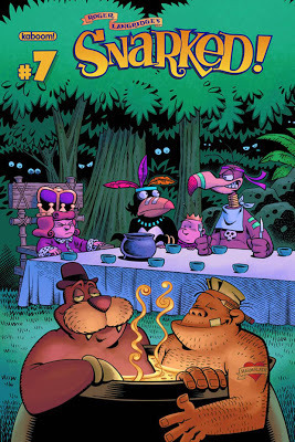 Roger Langridge's Snarked! Nº 7. "Náufragos en una isla desierta, sin comida ni mapa, nuestros héroes encuentran una antigua civilización perdida. Pero cuando la Morsa y el Carpintero son tomados por gordos dioses, ¿podrán evitar Scarlett y Rusty terminar en la olla?". Por Roger Langridge.