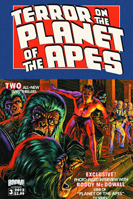 Terror on The Planet of the Apes Nº 3. "La clásica reedición de El planeta de los simios sigue adelante. En 1974, Marvel Comics publicó el magazine en blanco y negro The Planet of the Apes, que incluía una historia escrita por Doug Moench y dibujada por Mike Ploog: Terror on The Planet of the Apes. Ahora, BOOM! está reeditando esta pieza perdida en la historia simiesca; y esta entrega incluye los episodios Spawn of the Mutant Pits y The Abomination Arena!". Portada de Bob Larkin.