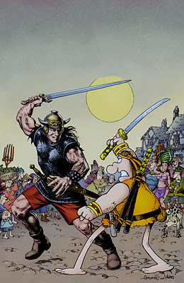 Groo vs. Conan Nº 1. "Tenía que pasar: El más heroico guerrero de la historia se encuentra con el más estúpido, cuando el inmortal Conan el bárbaro creado por Robert E. Howard cruza espadas con la creación de Sergio Aragonés, Groo el vagabundo, en Groo vs. Conan. Esta miniserie de cuatro entregas fue imaginada por el equipo ganador del Premio Eisner, Mark Evanier y Sergio Aragonés, ayudados por el gran ilustrador Thomas Yeats y el maestro colorista Tom Luth. ¿Podrá Conan aniquilar a Groo? ¿Será Groo el hombre que pueda derrotar a Conan? Veremos". ¡La quiero ya!