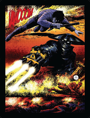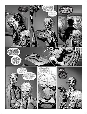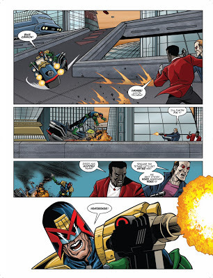 Los británicos han sido (y lo siguen siendo) grandes dialoguistas. Y por eso se agradece que gran parte de la ciencia-ficción de 2000 AD se resuelva hablando. Se asuma cerebral antes que corporal, priorice las ideas por sobre los movimientos físicos. La acción no pasa sólo por el desplazamiento espacial de los personajes (que está), los efluvios de testosterona (que están), los tiros, las trompadas y la violencia gratuita (que están). La acción fluye desde la tensión. Entre los personajes, pero también entre las teorías y las prácticas. Gran parte de este número puede ser leído como un estudio de los roles jugados por el Estado y la ciudadanía, del choque entre ambos cuando los intereses no confluyen. El reflejo de la crisis económica y (sobre todo) moral que azota al mundo pero sopla con particular intensidad en la vieja Europa. La posibilidad de modificarlo todo ejerciendo la toma de decisiones personal y/o colectiva. Y la apuesta a favor de un axioma aterrador: Todo tiempo futuro será peor.
