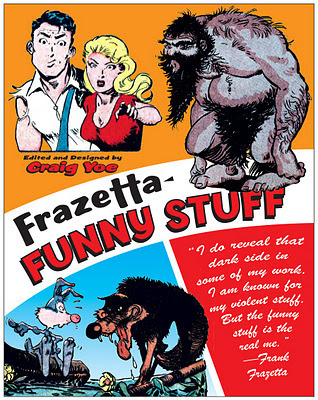 Funny Stuff by Frank Frazetta. "Frank Frazetta ha sido (con justicia) denominado como El Gran Maestro del Arte Fantástico. Sin embargo, es poco conocido que Frazetta también conquistó otros mundos de la Edad Dorada de los cómics, como lo demuestran sus historias cómica de animales antropomórficos o hilarantes habitantes de la montaña. Y aún aquellos que estaban al tanto de esta faceta de Frazetta, no sabían cuan grande era su extensión. La de este libro, con 256 páginas en gran tamaño. ¿Mencionamos también que hay feroces y terroríficos lobos y criaturas pantanosas entre la gran cantidad de historias con animales ilustradas por Frazetta cómo sólo él podía hacerlo? Y leones y tigres y osos… Todo ello antes de que las famosas pinturas de Frazetta abrazaran los mismos tópicos. Pero esperen, hay más: Podrán apreciar la semilla de la chica Frazetta en las aventuras adolescentes de la sexy Kathy. Y la doble hot de Daisy Mae, Clarabella, en las cómicas historias del montañés Looey Lazybones. La introducción corre por cuenta del afamado director de dibujos animados Ralph Bakshi, que conoció bien a Frazetta y trabajó con él como co-productor del filme animado Hielo y Fuego. Y por ello, Bakshi nos comparte pensamientos, anécdotas, fotos y dibujos de Frazetta. Incluso, Bakshi realizó una pintura especial de Frazetta y él mismo como animales antropomórficos para este hermoso y delicado libro, editado y diseñado por Craig Yoe".