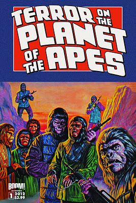 Terror on the Planet of the Apes Nº 1. "En 1974, Marvel Comics publicó el magazine en blanco y negro Planet of the Apes, con una historia escrita por Doug Moench (co-creador de Moon Knight) y dibujada por Mike Ploog (co-creador de Ghost Rider): Terror on the Planet of the Apes! Con una nueva Era de los Simios desarrollándose entre la serie de BOOM! y la película Rise on the Planet of the Apes, ustedes se comunicaron con nosotros vía Facebook, se comunicaron con nosotros vía Twitter; y nosotros los escuchamos. A pedido del público, reimprimimos este clásico. El primer número incluye The Lawgiver y Fugitives on the Planet of the Apes".
