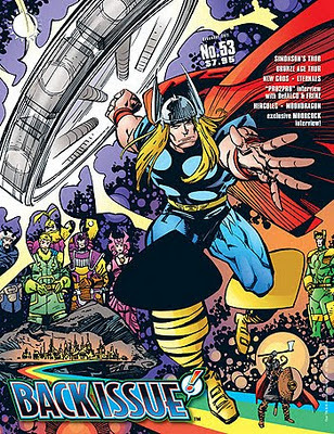 Back Issue Nº 53. "Echamos una profunda mirada al Thor de Walter Simonson en este número dedicado a los Dioses. Y hay más Dios del Trueno con una entrevista De profesional a profesional entre Tom DeFalco y Ron Frenz, sobre su labor en el Thor de la Edad de Bronce. Además: Hercules, Prince of Power, Moondragon, tres maneras de terminar la saga de los New Gods de Kirby; y una entrevista exclusiva con el escritor Michael Moorcock (creador de Elric de Melniboné). Presentando dibujos y/o comentarios de Gerry Conway, Jack Kirby y Bob Layton, entre otros. Con una portada de Thor arrojando su martillo, a cargo de Simonson. Editada por Michael Eury".