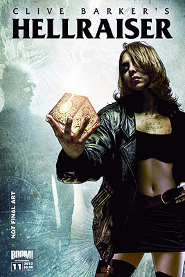 Hellraiser Nº 11. "Sean testigos del largamente esperado regreso de Clive Barker a la escritura de nuevos capítulos de la continuidad oficial de la serie, una trayectoria que cambiará para siempre a los cenobitas y a Pinhead. En este número, la nueva y asombrosa realidad de Hellraiser es un hecho. Un nuevo comienzo para Kirsty Cotton y Pinhead. ¡Sin reglas! ¡Nadie está a salvo! Clive Barker cambiará la manera que tienes de mirar a Hellraiser, así que no te pierdas este nuevo capítulo en la historia del terror". Por Clive Barker y Anthony DiBlasi (guión), Stephen Thompson (dibujos); y Tim Bradstreet y Nick Percival (portadas).