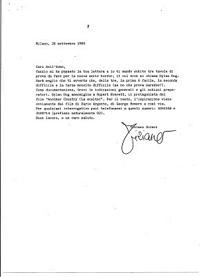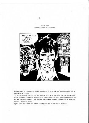 Página de la carpeta promocional de Dylan Dog (arriba) y una carta de Tiziano Sclavi (abajo)