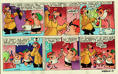 El guión se me hace soso y repetitivo, tal vez porque ya conozco de memoria la fórmula que lo sustenta. La obviedad es la norma. Las sentencias moralizantes (algunas bastante discutibles, representativas de un imaginario social conservador y naturalizado) abundan y sobreabundan en un tipo de humor blanco que supo ser definido como "familiar". Registros más que interesantes para abordar desde el estudio de las ciencias sociales, pero que no valoran cualitativamente a una historieta. El dilema, claramente, no está en las Aventuras de Hijitus, que siempre fueron así y que yo disfruté hasta que desaparecieron de los kioscos. El dilema, claramente, viene instalado por mi mirada actual, incapaz de abstraerse del agua pasada debajo del puente. De ahí que no sepa qué escribir. ¿Me gustó o no me gustó?