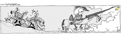 Puede ser por mi desconocimiento, pero tengo la sensación de que E de noite… es mucho más que un simple recuento, en clave de narración gráfica, de la génesis y los principales acontecimientos de la Primera República. Los hechos históricos están, pero el centro neurálgico de la historieta pasa (o me interesa hacerlo pasar) por la dialéctica entre los acontecimientos de orden político y su impacto en la vida cotidiana, en la capacidad que tienen ambas instancias para influirse, modificarse y resignificarse mutuamente. La injerencia del momento histórico en el discurrir de los ciudadanos que lo transitan con diferentes niveles de protagonismo. Más que como un periodo temporal específico, la República pareciera estar encarada como un ser vivo en estado de desarrollo. Y el principal condicionante de ese desarrollo estaría dado por la participación (individual y/o colectiva) de las personas en los procesos de construcción de la sociedad.