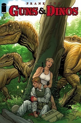 Guns and Dinos Nº 2. "Las cosas van de mal en peor. La comida, la gasolina y las municiones empiezan a acabarse en la base militar perdida en el tiempo. El coronel Norr implanta reglas draconianas para mantener con vida al golpeado equipo mientras enfrentan otro ataque de una invencible familia de T-Rex: Y se revela una nueva complicación, mucho más peligrosa que los carnívoros". Por Frank Cho.