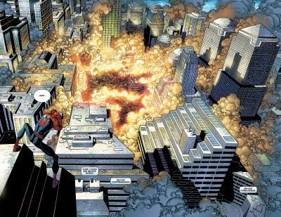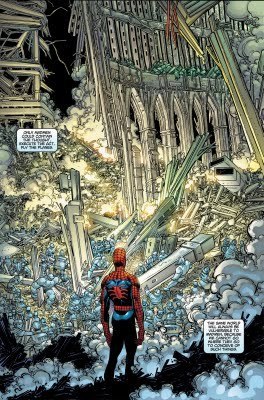 Como muchos otros miembros de las industrias culturales, los artistas de Marvel (y la propia Marvel) donaron horas de trabajo e ilustraciones varias con motivos benéficos. Pero esta The Amazing Spider-Man Vol. II Nº 36, desde el vamos, se planteó como algo distinto. Casi como una radiografía emocional de una ciudadanía en época de crisis extrema, de un país en guerra, de la misma idea de Democracia bajo ataque. Es comprensible, aunque uno pueda no compartirlo; y lo controvertido de este número radica justamente en ello. J. Michael Straczynski y John Romita Jr. (como los responsables más visibles del cómic) llevan a cabo una tarea políticamente correcta, sensible, más conmovida que conmovedora. A través de la mirada del Hombre-Araña (como par de ojos que refleja y condensa al Universo Marvel entero), buscan entender qué pasó, qué está pasando mientras ocurre lo incomprensible. Demuestran tacto en el manejo del tema, relativo buen gusto, una postura patriótica que al sur del Río Bravo resuena como demasiado patriotera. Mucho respeto y reconocimiento a los héroes reales que el mundo real arrojó como balance de esa jornada: Policías, bomberos, rescatistas sin otros superpoderes que coraje y voluntad. Pero carece de mirada crítica.