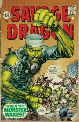 Savage Dragon Nº 177. "Osama Bin Laden está de regreso y quiere destruir a los EE.UU. El terrorista más buscado por los EE.UU. ha vuelto. Sólo que esta vez lo ha hecho como un mutado asesino gigante surgido del infierno, con la intención de destruir la tierra de los libres. Malcolm Dragon y Battle Girl deberán enfrentar la pelea de sus vidas, pero ¿qué chance tienen un par de estudiantes universitarios contra el enemigo público Nº 1 de los EE.UU.? Mientras tanto, una invasión alienígena comienza; y Savage Dragon está a millones de años luz de distancia". Por Erik Larsen.