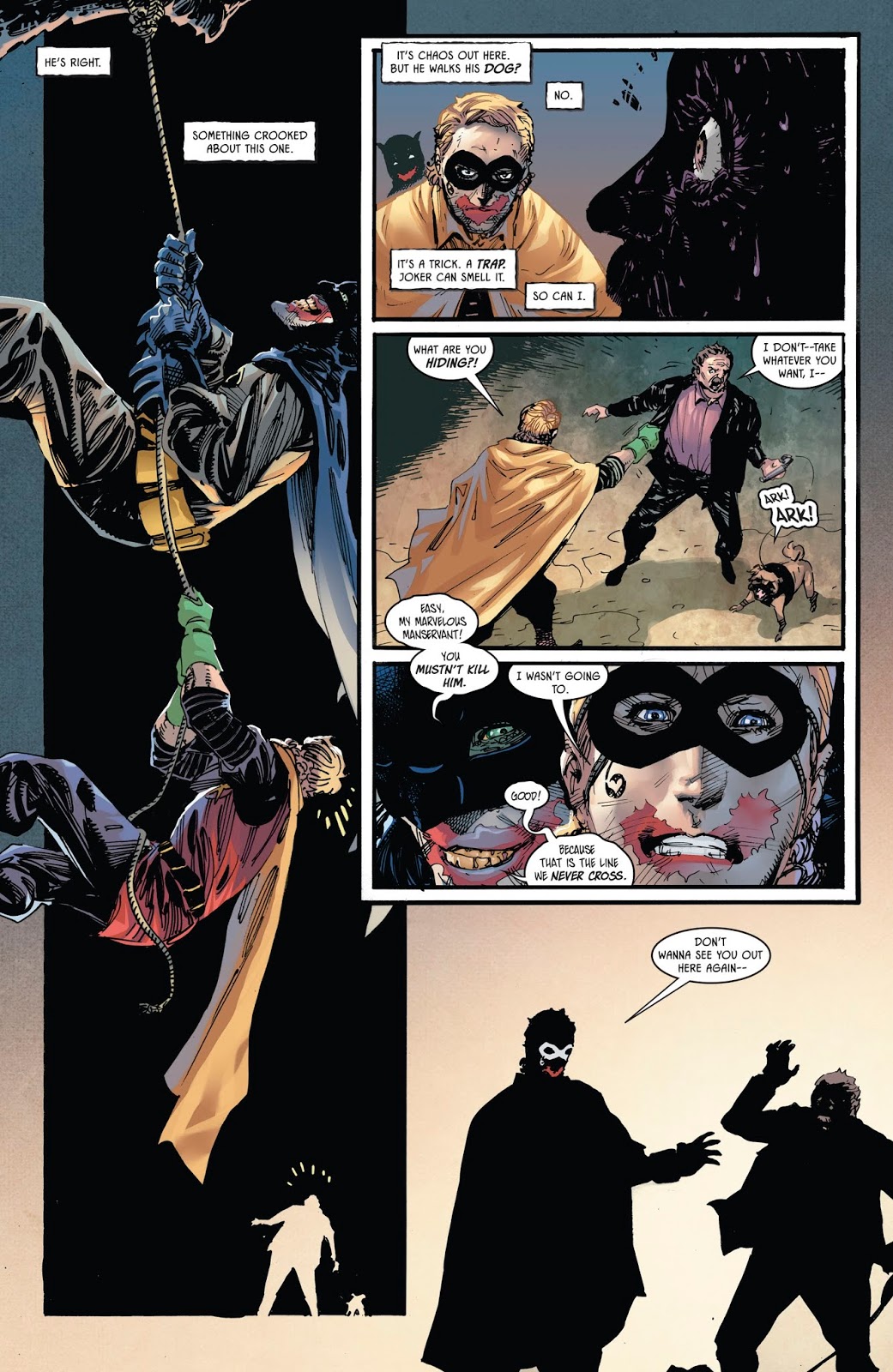 Y, por otro lado, al contar la historia desde el punto de vista de uno de los inútiles secuaces que solían acompañar al catódico Guasón interpretado por Cesar Romero, Carpenter y Burch deconstruyen la naturaleza identitaria del criminal, respondiendo la pregunta que nadie se había animado a hacer: ¿El Guasón es un demente inestable que comete actos malvados o un cuerdo malvado que comete actos dementes? Fernando Ariel García