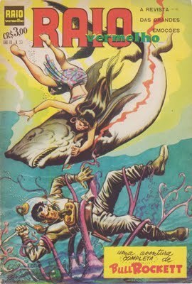 En el espectacular blog dedicado al gran historietista brasileño Jayme Cortez (http://jaymecortez.blogspot.com/), publicaron esta portada de la edición local de Raio Vermelho (Rayo Rojo) Nº 53, con un dibujo de Cortez para el oesterheldiano Bull Rockett.