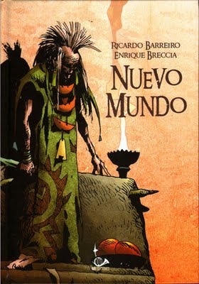 Nuevo mundo. 001 Ediciones. "Año de gracia de 1492, bajo el mando de Cristóbal Colón cuatro carabelas -la Pinta, la Niña, la Santa María y la Intrépida- zarpan del puerto de Palos para aventurarse en el Atlántico. El objetivo de la misión es temerario y ambicioso: llegar a las Indias navegando hacia el oeste. Pero, ¿Por qué la historia oficial de esta trascendental expedición ha mantenido siempre oculta la existencia de la cuarta embarcación? ¿Por qué la Intrépida nunca llegó a tocar las costas de América central? ¿Qué fue de los marineros que llevaba embarcados? La increíble respuesta la podemos descubrir en Nuevo Mundo, una novela gráfica de aventuras, plena de fantasía y la magia, fruto de la conjunción de dos de los mayores talentos del cómic argentino: Ricardo Barreiro (el escritor de Slot Barr o Bárbara) y Enrique Breccia (responsable de obras maestras como El Sueñero o Alvar Mayor)".