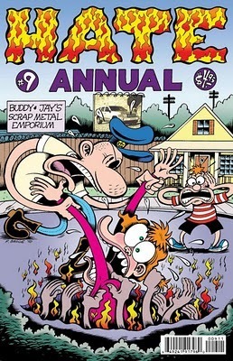 Hate Annual Nº 9. "Buddy y Lisa… ¡regresan a Seattle! En su primera aventura de larga duración en diez años, justo cuando las cosas parecían empezar a parecer idílicas para nuestros héroes, una crisis familiar fuerza a Lisa a re-unirse con sus padres en Seattle; y lleva a Buddy y a su joven hijo Harold consigo. Allí, Buddy descubrirá rápidamente porque estuvo evitando esta situación durante los últimos veintitantos años. Y Lisa recibirá otras desagradables sorpresas desde su árbol genealógico. Además, Peter Bagge explota el costado más politico de su humor en los chistos aparecidos originariamente en las publicaciones El Ríos, High Times y Seattle Weekly. Y, por supuesto, un par de avisos publicitarios".